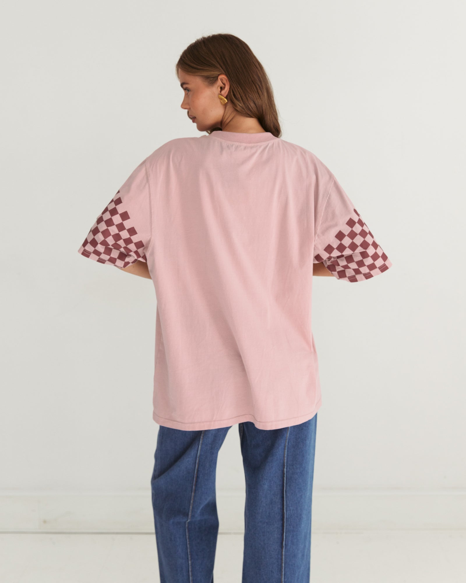 Retro western graphic print with checkered sleeve details.